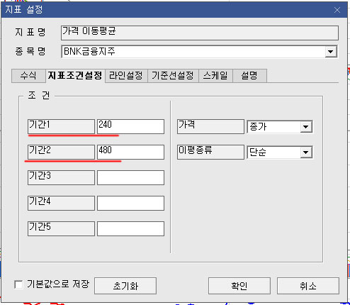 지표조건 설정에서 240 / 480을 적어준다.